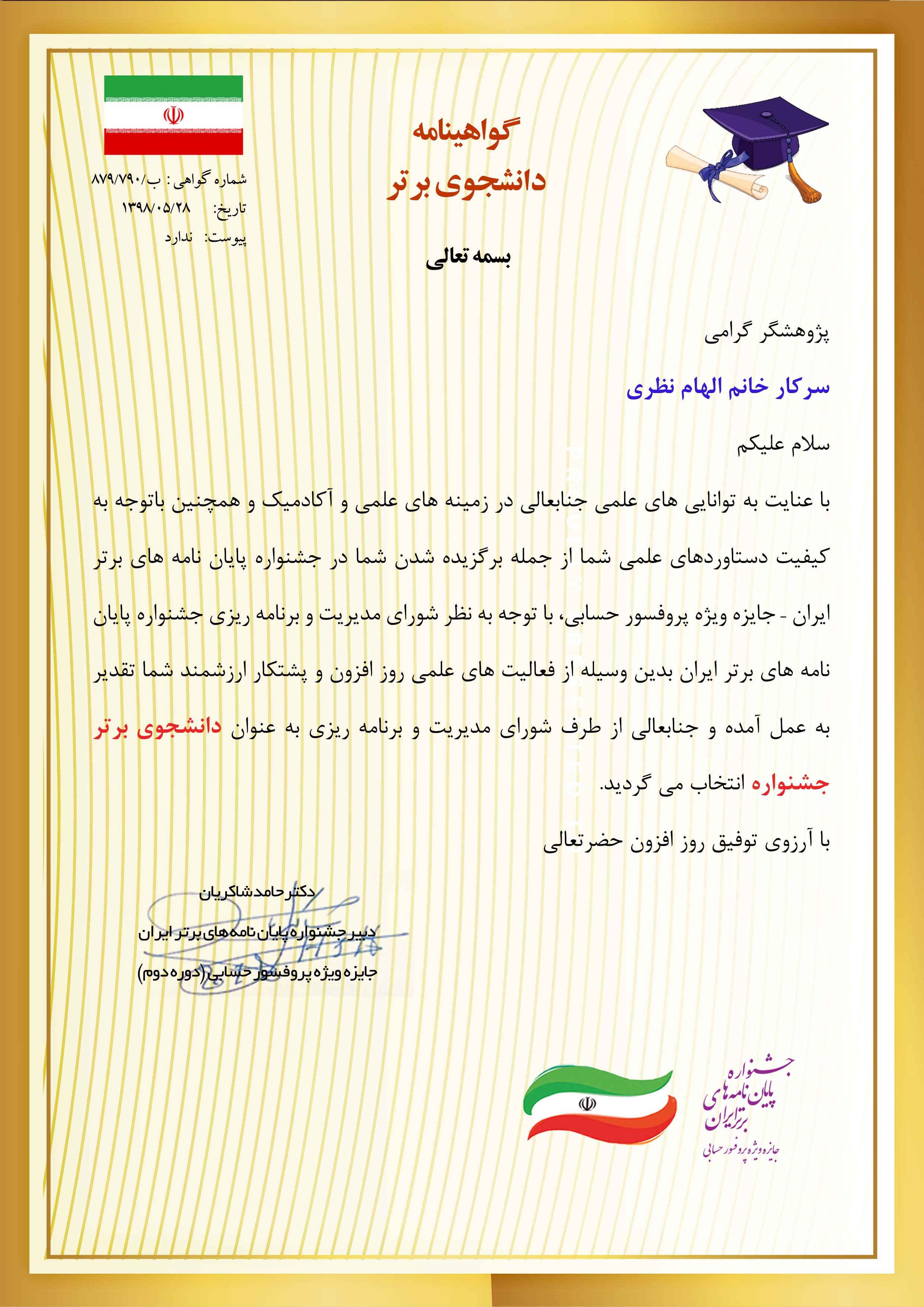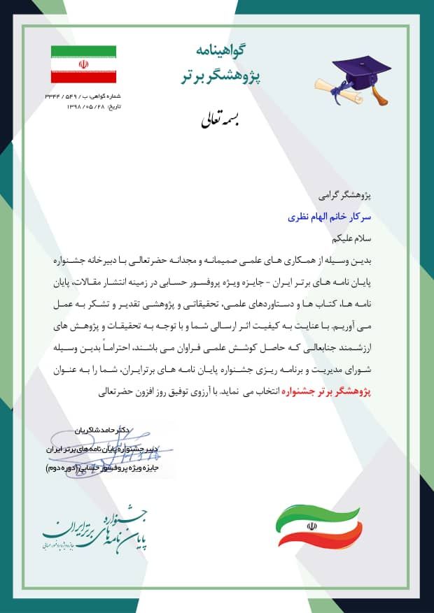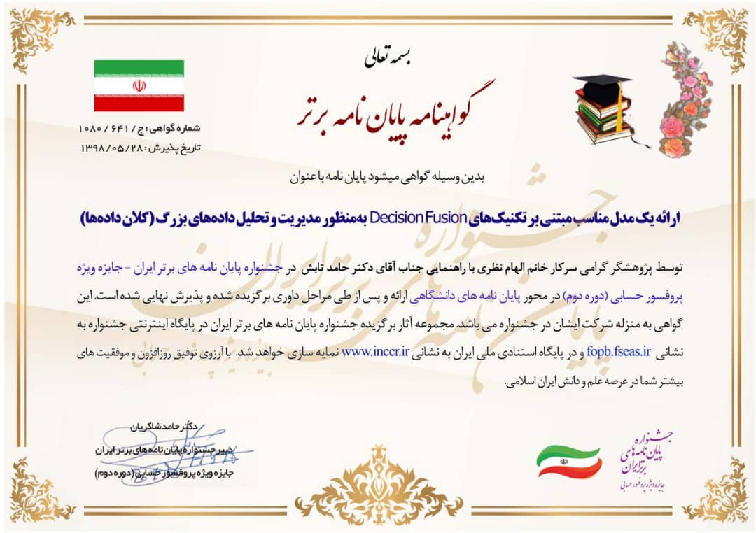 سرکارخانم دکتر الهام نظری با عنوان" ارائه یک مدل مناسب مبتنی بر تکنیک های Decision Fusion به منظور مدیریت و تحلیل داده های بزرگ (کلان داده ها )" با راهنمایی استاد ارجمند جناب آقای دکتر حامد تابش در جشنواره پایان نامه های برتر ایران - جایزه ویژه پروفسور حسابی (دوره دوم) در محور پایان نامه های دانشگاهی ارائه و برگزیده شده است.گروه انفورماتیک پزشکی دانشگاه علوم پزشکی مشهد برای اولین بار است که با تلاش ارزشمند اساتید و دانشجویان خود برنده جایزه پروفسور حسابی شده است. همچنین سرکار خانم دکتر الهام نظری از سوی شورای مدیرت و برنامه ریزی جشنواره پایان نامه های برتر ایران به عنوان پژوهشگر و دانشجوی برتر شناخته شده اند.