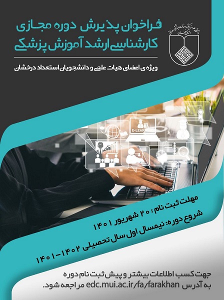 گروه آموزش پزشکی مدیریت مطالعات و توسعه آموزش پزشکی اصفهان، در نیمسال تحصیلی 1402-1401 از میان اعضای هیات علمی و دانشجویان استعداد درخشان داوطلب در مقطع کارشناسی ارشد مجازی رشته آموزش پزشکی، دانشجو می پذیرد.